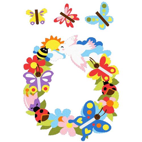 L'album contiene 1 maxi disegno (26x40cm) pretagliato su carta adesiva raffigurante una ghirlanda di primavera, pronta per essere colorate con la sabbia.